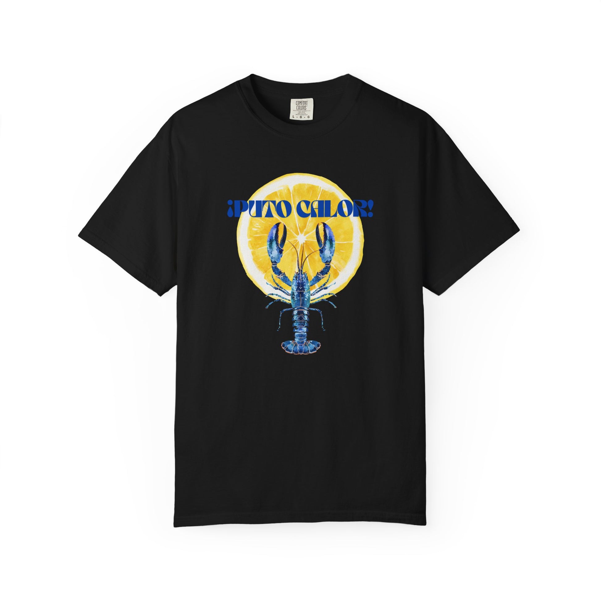 Bring the summer heat to your wardrobe with the ¡Puto Calor! Lobster Tee – a bold statement piece for sunny days, late nights, and everything in between. Featuring a vibrant blue lobster against a golden sun backdrop, this design is all about playful energy and beachside vibes.